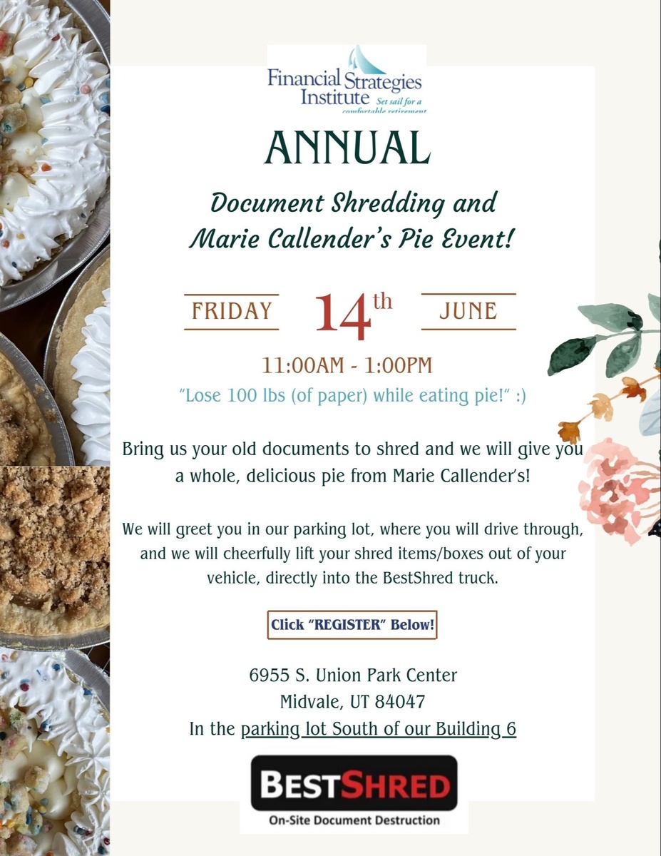 Bring us your old documents to shred and we will give you a whole, delicious pie from Marie Callenders!