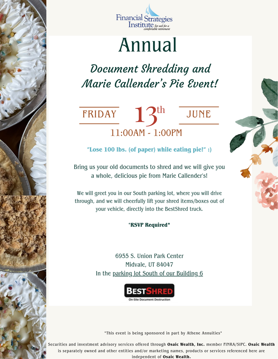 Bring us your old documents to shred and we will give you a whole, delicious pie from Marie Callenders!